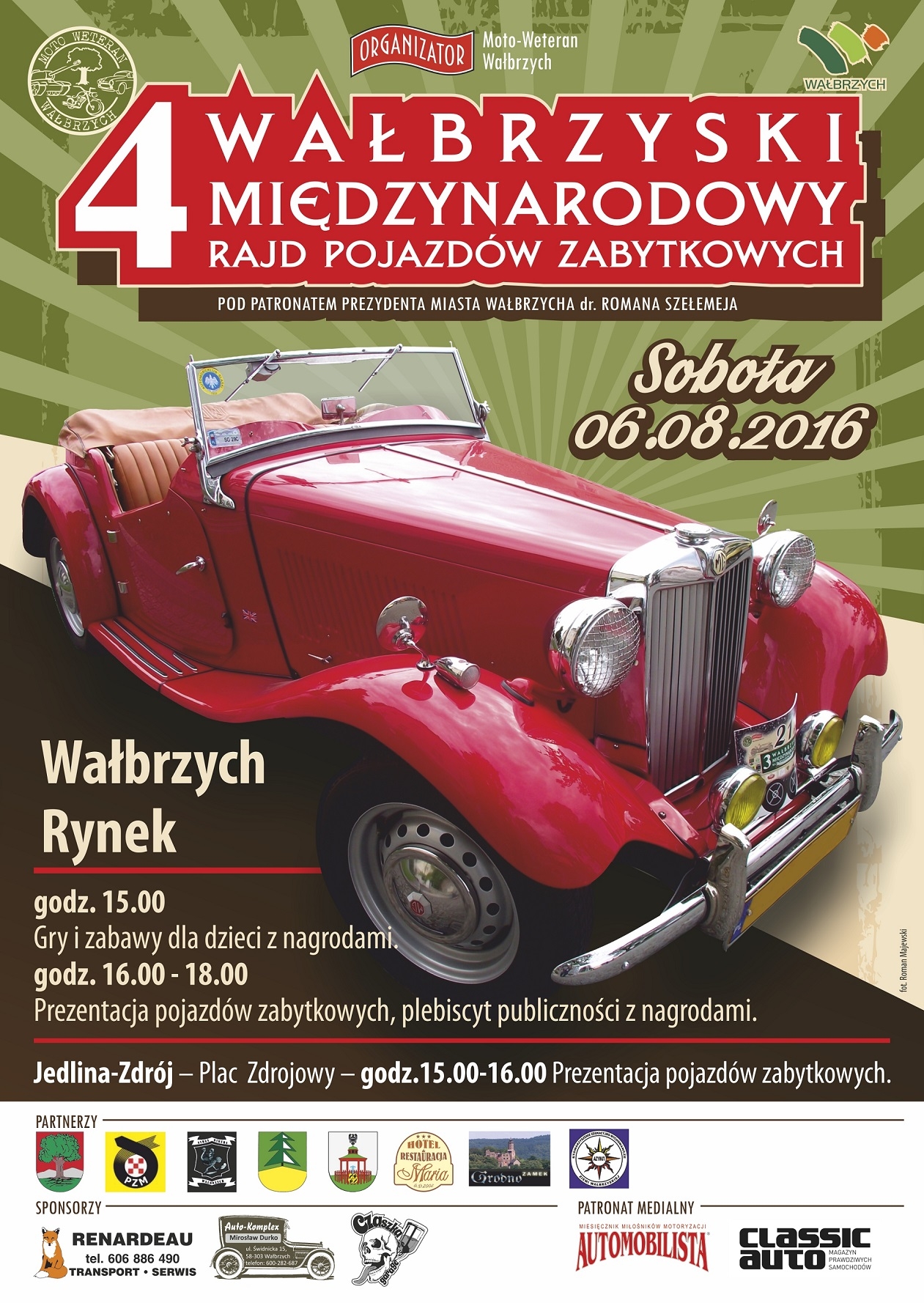 W dniach 05-07.08.2016 na terenie powiatu wałbrzyskiego odbędzie się 4 Wałbrzyski Międzynarodowy Rajd Pojazdów Zabytkowych zorganizowany przez Stowarzyszenie Moto Weteran Wałbrzych pod patronatem Prezydenta Miasta Wałbrzycha dr Romana Szełemeja.