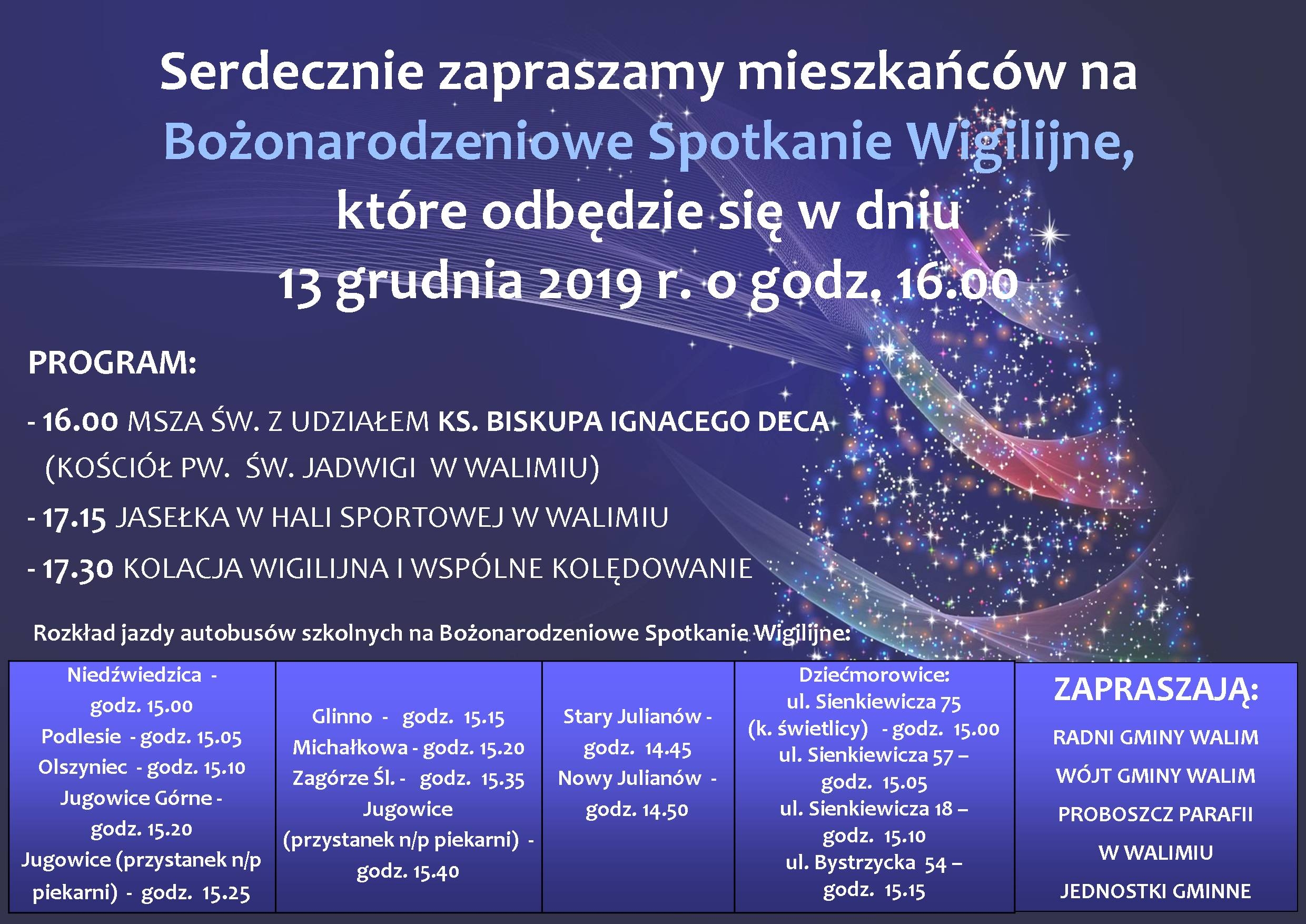 Serdecznie zapraszamy mieszkańców Gminy Walim na Bożonarodzeniowe Spotkanie Wigilijne w dniu 13 grudnia 2019.
