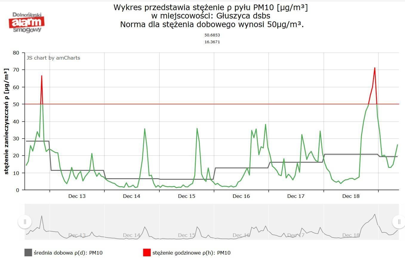 W dniach 12 grudnia 2019 r. – 19 grudnia 2019 r. w ramach regionalnej kampanii ekoedukacyjnej Dobra Atmosfera odwiedziliśmy Głuszyce, przybywając z pyłomierzem na zaproszenie władz miasta. Pomiary wykonywane były w zakresie stężenia pyłu zawieszonego PM10, przy pomocy profesjonalnego pyłomierza, który został ustawiony na dachu Szkoły Podstawowej numer 3 (ul. Kolejowa 8). Wyniki z pomiaru przedstawiają się następująco (linia pozioma obrazuje normę średniodobową dla PM10 – 50 µg/m3):