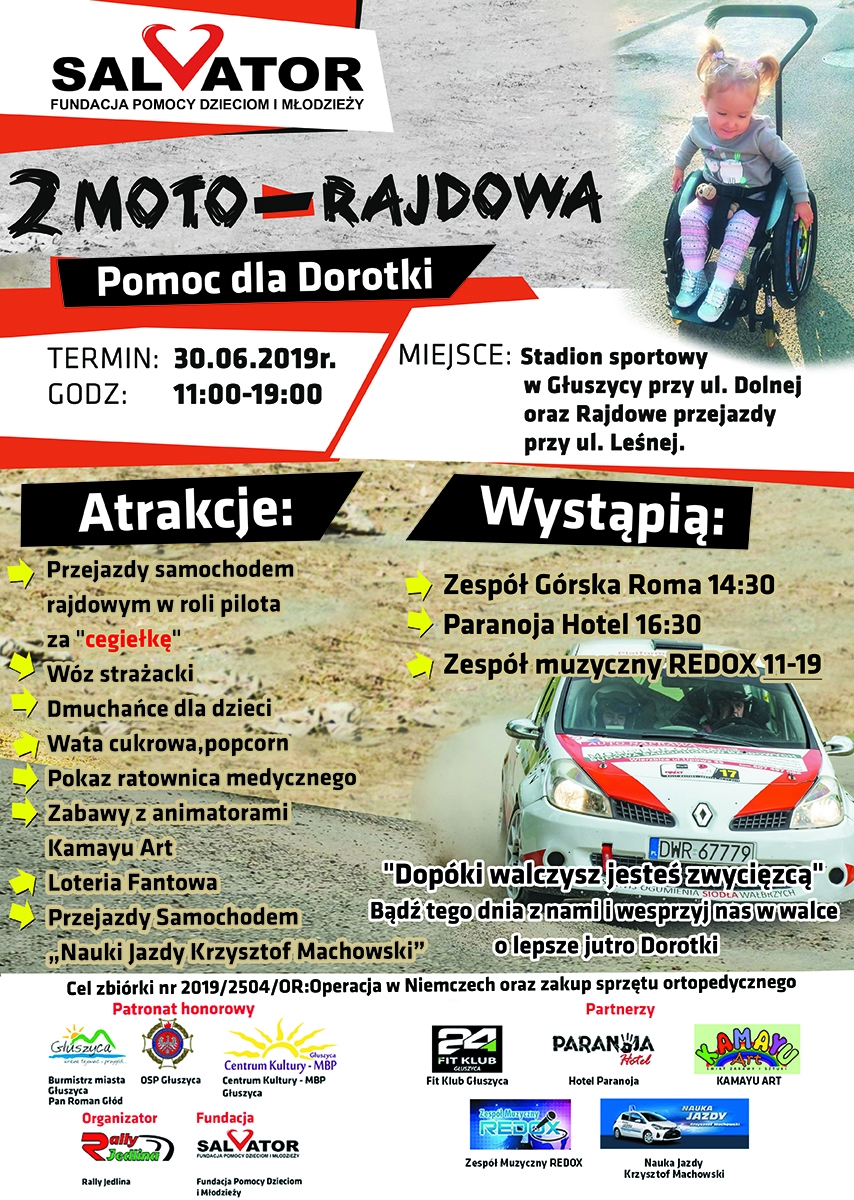 30 czerwca startuje II Moto-rajdowa pomoc dla Dorotki. Zapraszamy od godz. 11.00 do 19.00 na boisko sportowe przy ul. Dolnej w Głuszycy oraz na ul. Leśną, gdzie zorganizowane zostaną przejazdy samochodem rajdowym w roli pilota.