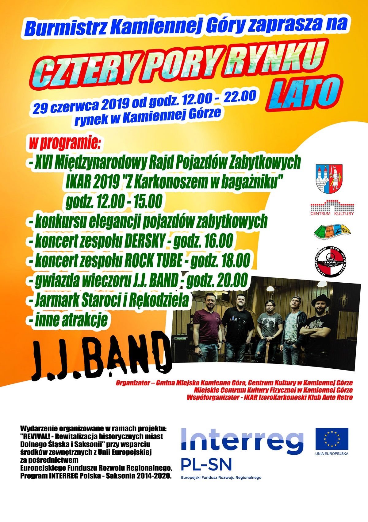 Tym razem spotykamy się już w samo południe gdyż o tej godzinie wjadą na rynek zabytkowe pojazdy, uczestnicy XVI Międzynarodowego Rajdu Pojazdów Zabytkowych IKAR 2019 „Z Karkonoszem w bagażniku”. Spośród uczestników tego rajdu, w konkursie elegancji, wybrane zostaną najładniejsze, najbardziej zadbane samochody w kategoriach oldtimer i youngtimer.