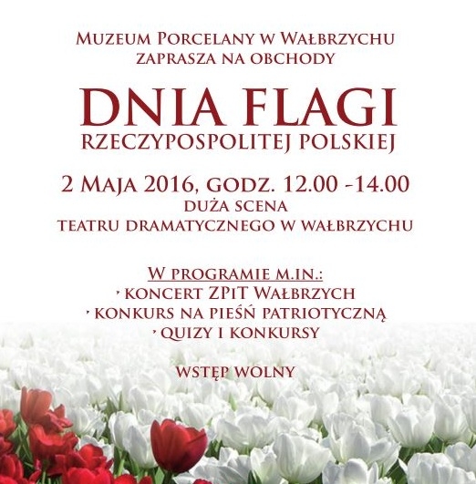 Z okazji obchodów Dnia Flagi Rzeczypospolitej Polskiej, Muzeum Porcelany w Wałbrzychu organizuje konkurs na Pieśń Patriotyczną. Konkurs adresowany jest do wszystkich wychowanków placówek edukacyjnych, w tym: szkół podstawowych, gimnazjalnych, świetlic i przedszkoli, a także do wszystkich chętnych osób indywidualnych do 16 roku życia. W konkursie mogą wziąć udział soliści oraz zespoły, liczące nie więcej niż 6 osób. Chęć udziału w konkursie można zgłaszać telefonicznie lub mailowo, do 30 kwietnia. Finał konkurs odbędzie się 2 maja w trakcie trwania obchodów Dnia Flagi Rzeczypospolitej Polskiej w Teatrze Dramatycznym w Wałbrzychu. Regulamin oraz karty zgłoszeniowe, do pobrania na stronie internetowej muzeum.