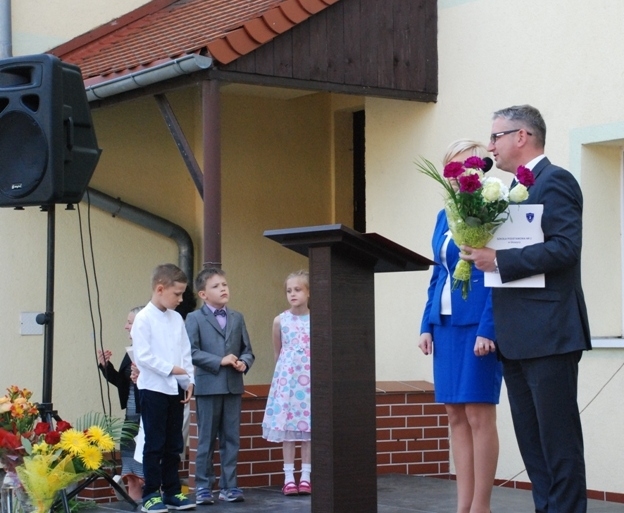 Dyrektor SP2 Aneta Musik w imieniu własnym, ale także Grona Pedagogicznego, rodziców, a przede wszystkim uczniów szkoły przekazała podziękowania dla: firmy Toyota Manufacturing Wałbrzych za przekazaną kwotą 12.800 zł z funduszu Toyoty, dla Pana Grzegorza Kruszyńskiego – Prezesa Fundacji Edukacji Europejskiej, dla burmistrza Głuszycy Romana Głoda za wkład własny Gminy Głuszyca w wysokości 18.000 zł, dla Państwa Marioli i Jana Sandurów, którzy bezpłatnie przekazali kamień oraz piasek stanowiący nawierzchnię pod urządzenia oraz dla Pana Waldemara Rubika za przygotowanie terenu pod inwestycję.