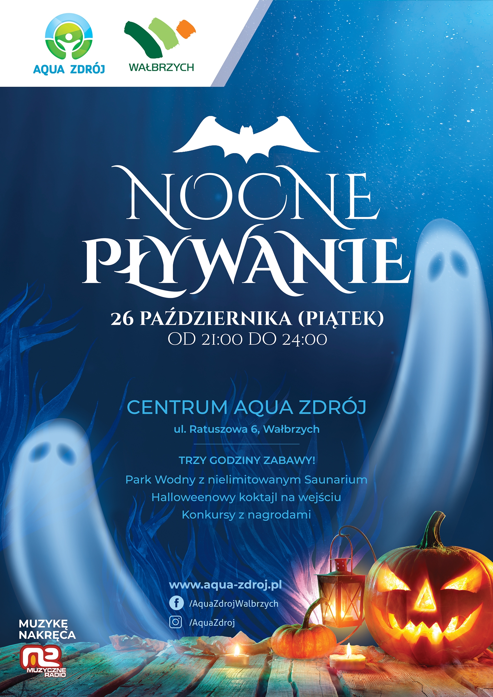 Zachęcamy do wzięcia udziału we wspólnej imprezie halloweenowej w Parku Wodnym. O oprawę muzyczną i dobrą atmosferę zadba DJ prosto z Muzycznego Radia. „Mordercze figury”, „Bieg zbłąkanych dusz” czy „Trupy w wodzie” to tylko niektóre z konkursów z nagrodami, które czekają na uczestników. Dodatkowo odbędą się tematyczne zajęcia aqua aerobiku. Dla każdego na wejściu czekać będzie darmowy halloweenowy koktajl. Pomysłowe mroczne stroje mile widziane, a dla osoby z najlepszym przebraniem przewidziana nagroda! Koszt wstępu na imprezę to 35 zł, wejściówki w dniu imprezy.  Start o godzinie 21, bawimy się do północy!