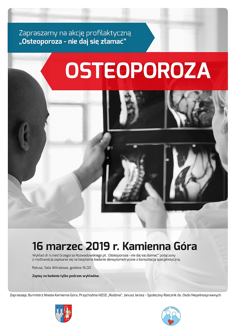 Zapraszamy Państwa na otwarte spotkanie dotyczące problematyki osteoporozy połączone z bezpłatnymi badaniami w tym kierunku. Spotkanie odbędzie się w sobotę 16 marca w sali witrażowej kamiennogórskiego ratusza, początek godz. 16.00. Szczegóły spotkania na plakacie.