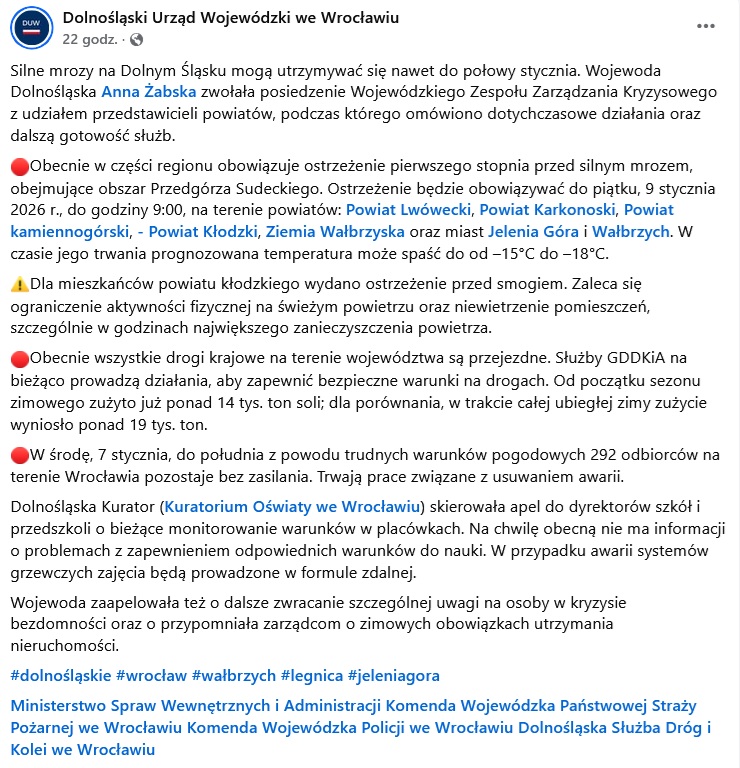 Ze względu na ważny interes społeczny związany z ochroną ludności cywilnej, postanowiliśmy przytoczyć, wydawałoby się ważny komunikat wojewody Żabskiej, która powołała sztab kryzysowy w reakcji na silne mrozy i zanieczyszczenie powietrza.