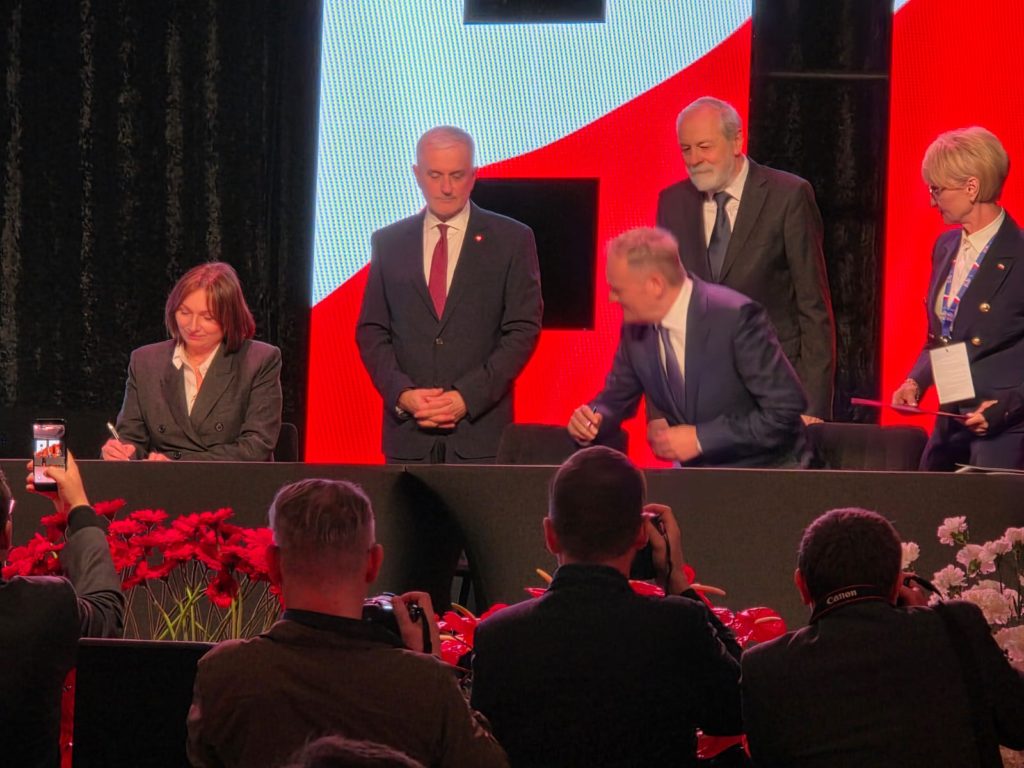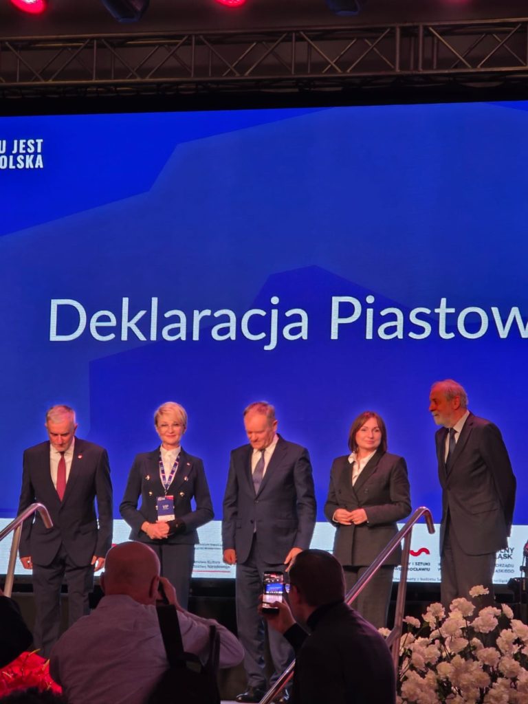 Niestety to nie koniec kompromitacji organizatorów tak uroczystej rocznicy. Jednym z punktów obchodów było podpisanie Deklaracji Piastowskiej i tu zaczyna się CYRK. Na scenie postawiono stół z czterema krzesłami . Jedno dla Premiera, drugie dla Prezydenta Szełemeja, trzecie dla Prezydent Kołobrzegu i czwarte dla Wicemarszałka Senatu Rafała Grupińskiego.