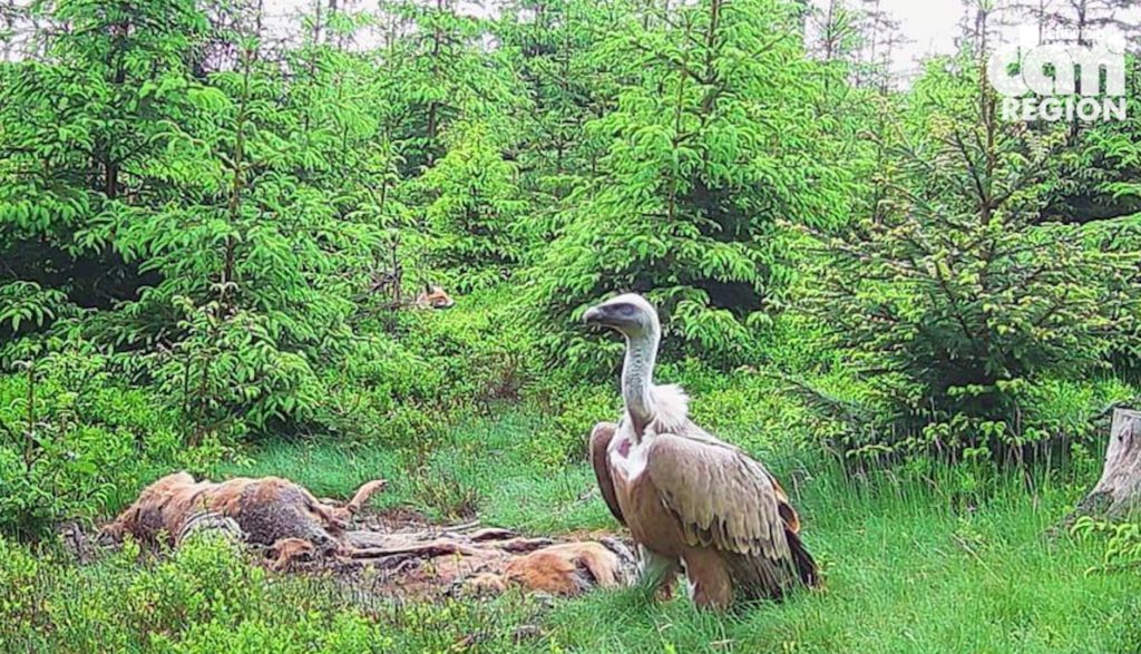 Sęp płowy z Jugowa nie żyje! VIDEO. Podczas próby poderwania się z ziemi, by zasiąść na linii wysokiego napięcia, dotknął skrzydłem drugiej linii… i został porażony prądem.