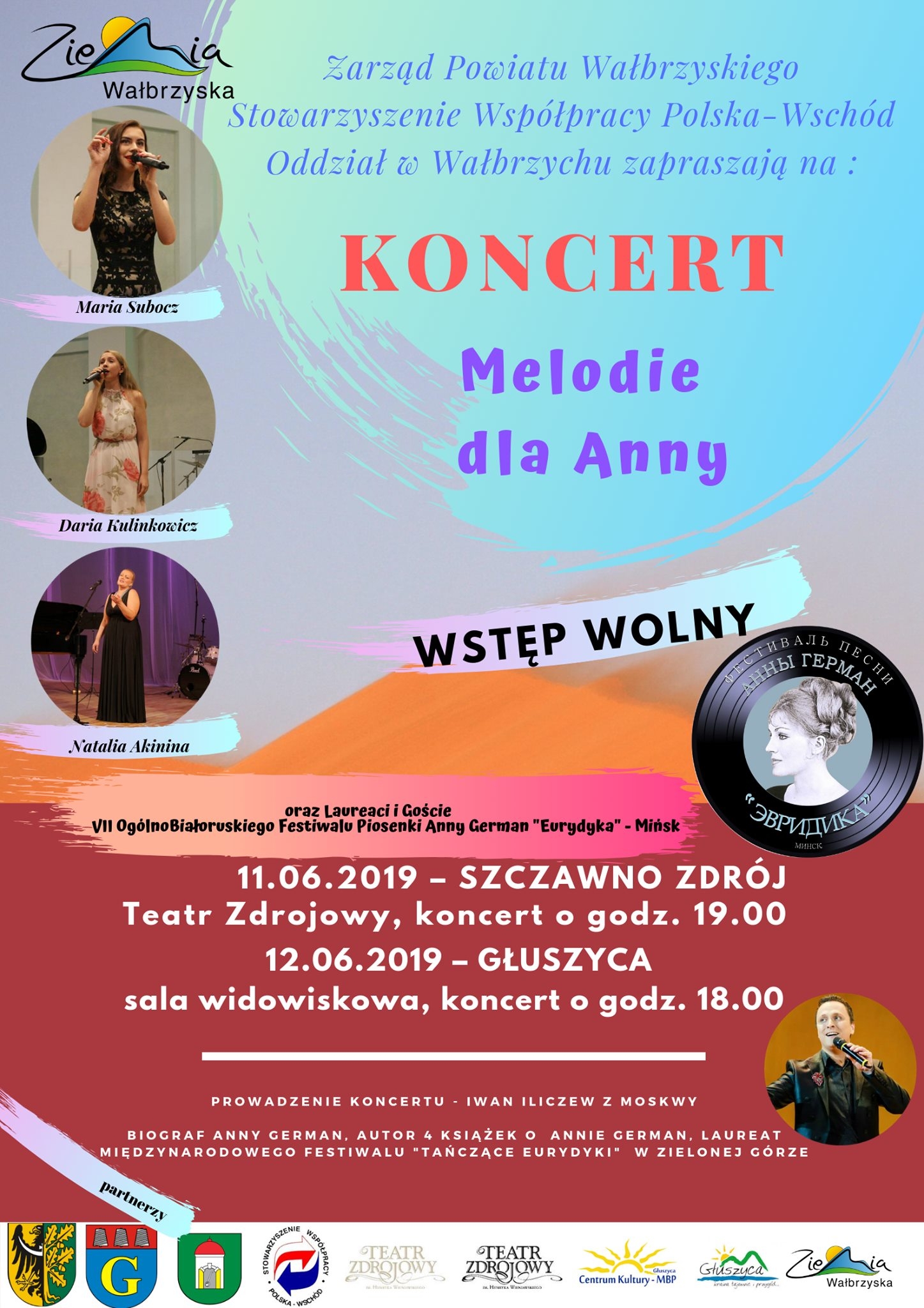 Zarząd Powiatu Wałbrzyskiego, Oddział Wałbrzyski Stowarzyszenia Współpracy Polska – Wschód zapraszają na koncerty laureatów i gości VII Festiwalu Piosenki Anny German „Eurydyka” z Białorusi.w koncertach wystąpią między innymi ;