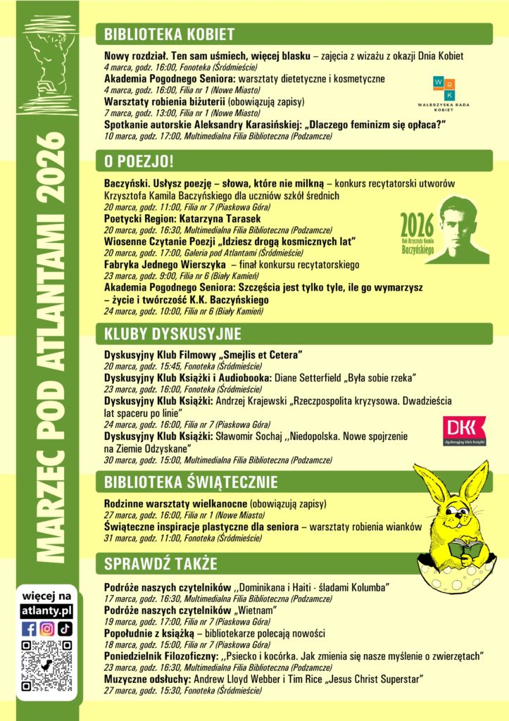Wiosna w Bibliotece pod Atlantami zapowiada się intensywnie. Przygotowaliśmy bogaty program wydarzeń, który łączy spotkania autorskie, warsztaty kreatywne oraz wieczory poświęcone wielkiej poezji.