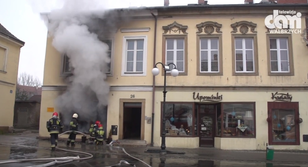 Pożar wybuchł na parterze w sklepie w rynku. Na piętrze mieszkała około 80- letnia kobieta, która została ewakuowana.
