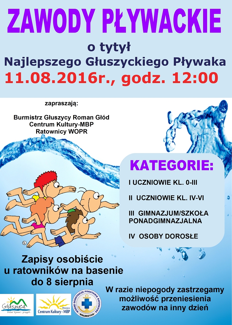 Burmistrz Głuszycy Roman Głód, Centrum Kultury- MBP, ratownicy WORP zapraszają do rywalizacji o tytuł Najlepszego Głuszyckiego Pływaka w czwartek 11 sierpnia w czasie zawodów pływackich, które rozpoczną się o godz.12.00 na basenie w Głuszycy przy ul. Dolnej 2.